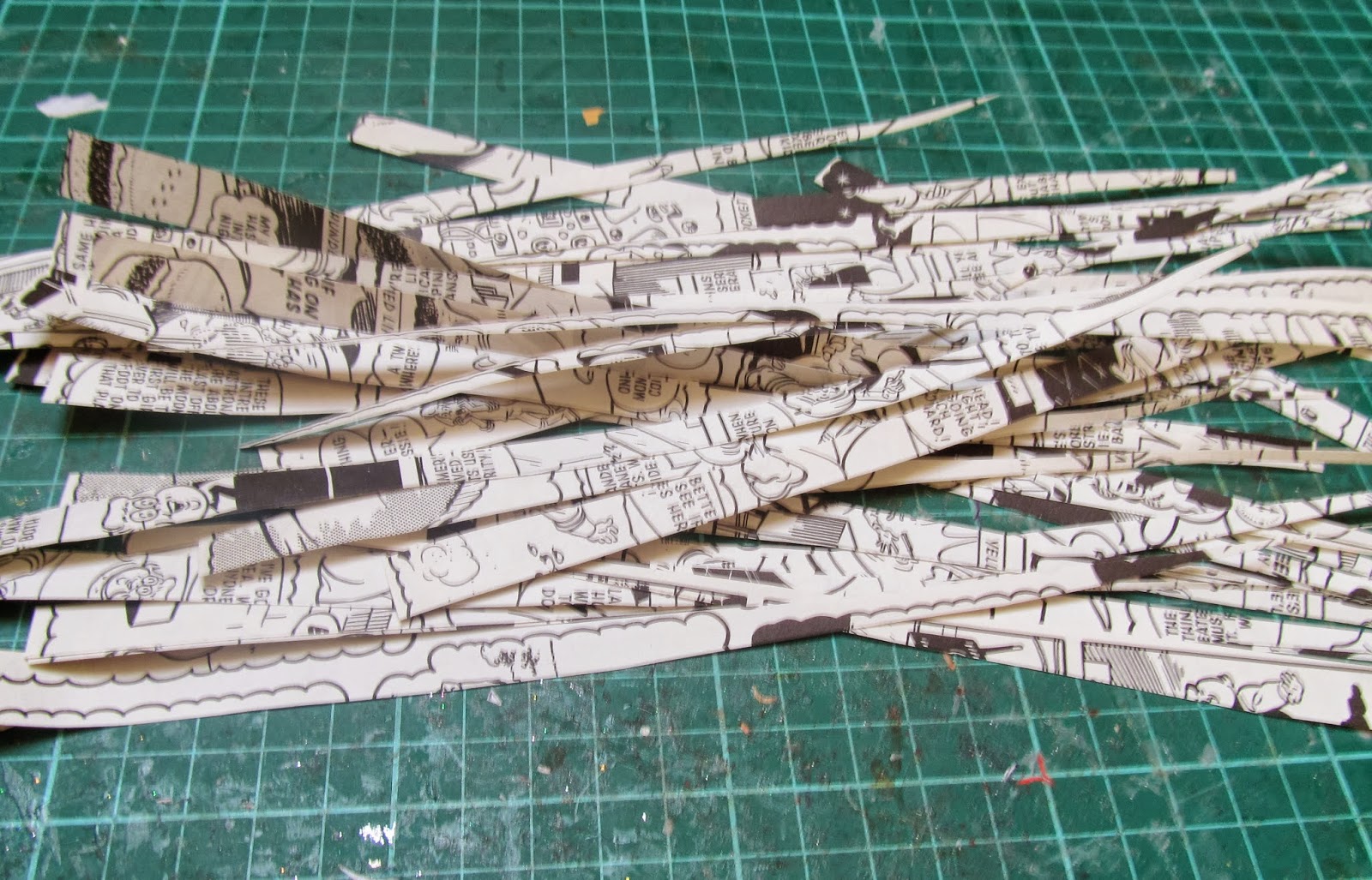 The paper I use here are pages from an old comic annual which was worse for wear. I chose decent pages to upcycle, although this is a good way to use up damaged pages as the paper is rolled up (try some first to make sure the finished bead looks good).Cut the paper into strips which taper down like long triangles. These strips are about 1cm wide by 25cm long.
