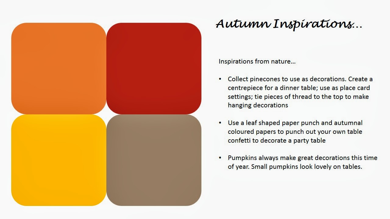 If you're decorating a party or dinner table for an October birthday the beautiful colours of autumn make a great palette to work with.![]() | |||