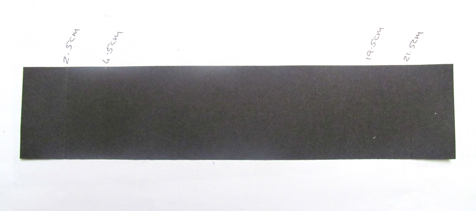 Take the piece of black card measuring 5x24cm and place it in front of you with the long side running along the top and bottom (landscape). Mark lines at 2.5cm, 4.5cm, 19.5cm and 21.5cm running vertically. Fold the card inwards along these lines.