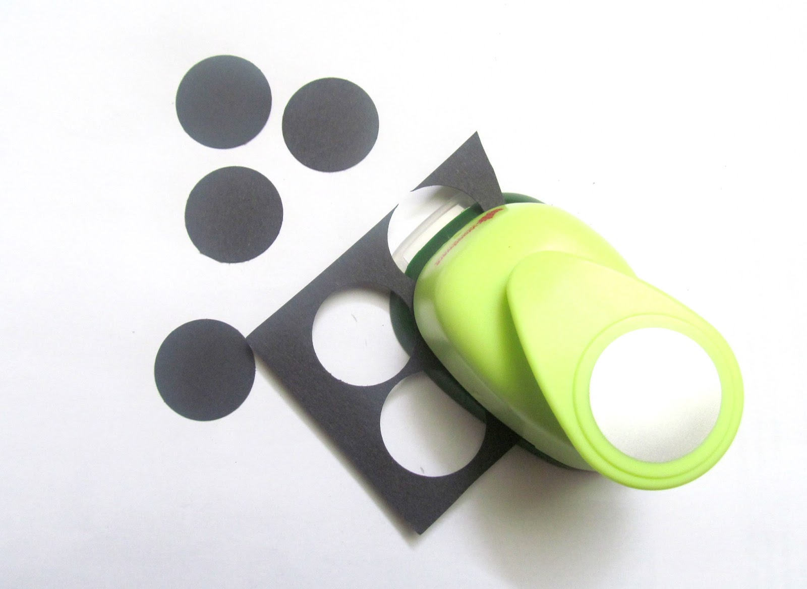 Use the circle punch (or draw around a coin) to make 4 black circles using the same piece of card you cut the wings from.