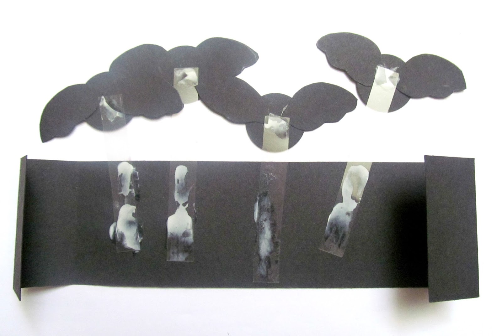 Lay the card you've just folded down in front of you with the folded over parts sticking upwards. Spread some glue onto the bottom 2cm of a strip of the acetate with a bat stuck on top - make sure the glue in on the front of the acetate. Stick this strip to the piece of black card that is flat in front of you. Repeat with the other acetate strips.