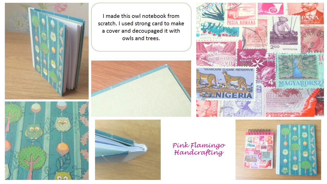 I was feeling creative one day last year and decided to try and make a notebook from scratch. I cut some blank white paper which I stuck together down the left hand side to make a 'spine' and then made a cover out of cardboard scoring a space for the note paper to fit in. Then I covered the outside of the front and back covers with paper which I folded and secured inside each cover and added some little owls as decoration.