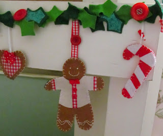 I love gingerbread men (and women!). They always look so festive and cheery. When I wanted to make a garland for the rail across the top of the stairs last year they were my first choice. I used felt to give a bright and homely look choosing a gingery colour for the people and hearts and festive red, white and greens for the candy canes and holly leaves. The people are made simply by drawing around a gingerbread man cookie cutter twice, decorating one side with ribbons, bows, buttons and white embroidery thread then using blanket stitch to sew the two sides together. The gingham ribbons hold them on a length of cord which I then covered with felt holly leaves and big red buttons to look like berries. It took quite a while to make but I think it's definitely worth it!