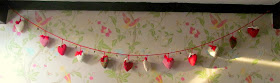 I made myself this garland a couple of years ago when I was stuck at home in the run up to Christmas with Whooping Cough. I didn't feel like going shopping for decorations (nor did I think other shoppers would appreciate witnessing one of my coughing fits!) so I made quite a few for myself with what I had in the house. These little hearts are made from Christmas coloured fabrics, stuffed and finished with bows and buttons. A hanging ribbon then holds them to a length of cord and little jingle bells are spaced between them.
